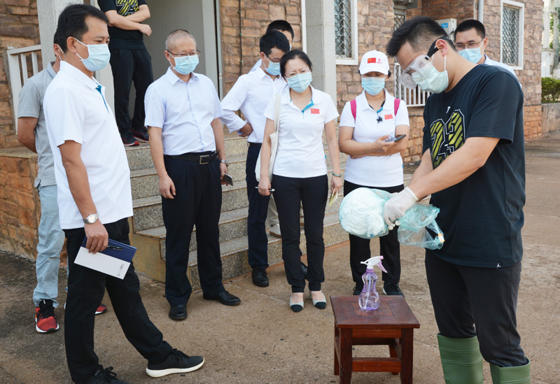 隨后,雙方開展了防疫應(yīng)急演練。演練方案假設(shè)一名員工出現(xiàn)發(fā)熱乏力等疑似癥狀,應(yīng)急處置人員按照應(yīng)急方案開始采取措施,包括發(fā)現(xiàn)并報(bào)告員工情況、隔離發(fā)熱員工、啟動(dòng)應(yīng)急預(yù)案、排查并對(duì)密切接觸人員進(jìn)行隔離觀察、聯(lián)絡(luò)醫(yī)療隊(duì)進(jìn)行遠(yuǎn)程診斷、現(xiàn)場(chǎng)消殺作業(yè)、報(bào)送代表處及疫情防控辦公室、轉(zhuǎn)運(yùn)送往定點(diǎn)醫(yī)院進(jìn)行診斷、在檢測(cè)排除新冠后上報(bào)診斷結(jié)果和接下來(lái)的處置程序等環(huán)節(jié)。援喀醫(yī)療隊(duì)專家一行全程參與和記錄,并在每個(gè)環(huán)節(jié)給出指導(dǎo)意見。