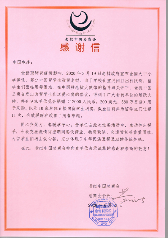6月12日,中國電建老撾代表處收到了來自老撾中國總商會和老撾國立大學中國留學生發來的感謝信,對在老撾新冠疫情防控期間,中國電建及廣大員工獻出愛心,履行企業社會責任的積極表現給予了充分肯定和感謝。