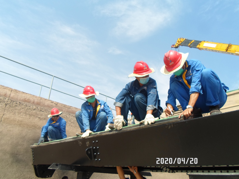 在沒有人手的時候,項目部打破工種限制,29個中方員工從上到下,披掛上陣。那些曾經手握鋼筆、敲擊鍵盤的手,現在拿起了扳手、拉起了起吊葫蘆。大家不分部門,不分你我,相互配合,做好現場的施工工作。桁架上,項目經理正在搖閘門手柄,技術人員在調整抱閘間隙;起重機旁,有人在搬枕木,墊支腿,穿繩掛鉤;另一個作業面上,有人頂著太陽在打孔,焊接,打磨,拼裝。每個人的額頭上都堆滿了汗珠,汗水打濕了衣服,一天的工作下來,衣服后背上都有一道道的汗漬,一圈圈的汗花,卻沒有一個人叫苦叫累。