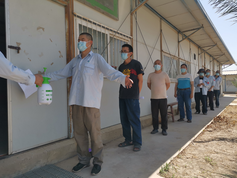 伊拉克境內疫情蔓延的同時,華事德電站#5和#6機組年度檢修工作還未結束,業(yè)主方人員流量大、流動密集,給現場疫情防控帶來了巨大壓力。項目部根據伊拉克國內疫情的發(fā)展,制定了系列的項目現場防控措施,包括定期消毒、增加中伊方人員體溫監(jiān)測頻次、全員必須佩戴口罩、生活區(qū)封閉管理、加強個人衛(wèi)生管理等各種預防手段。
