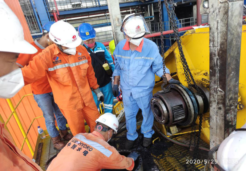 于是項目部立即組織人員現(xiàn)場檢查,并與設備廠家視頻在線診斷,最終確定為撈渣機驅動裝置的減速機故障。可是印尼當?shù)貦z修人員又因節(jié)日休假,情急之下,項目當即決定動用現(xiàn)場現(xiàn)有全部檢修力量,連夜拆解設備。那一晚,瓢潑大雨在炎熱的印尼像往日一樣如約而至,然而所有檢修人員卻毫不退縮,一頭扎進雨幕中,熱火朝天干起來,汗水和著雨水從他們堅毅的臉龐不斷流下,那專注的神情和堅如磐石的背影讓人肅然起敬,夜幕下,他們工裝上中國水電的字樣份外醒目,最后連夜完成檢修工作,鍋爐撈渣機恢復正常運營,印尼方為之動情而大贊盛贊,驚嘆著中國速度和中國力量!
